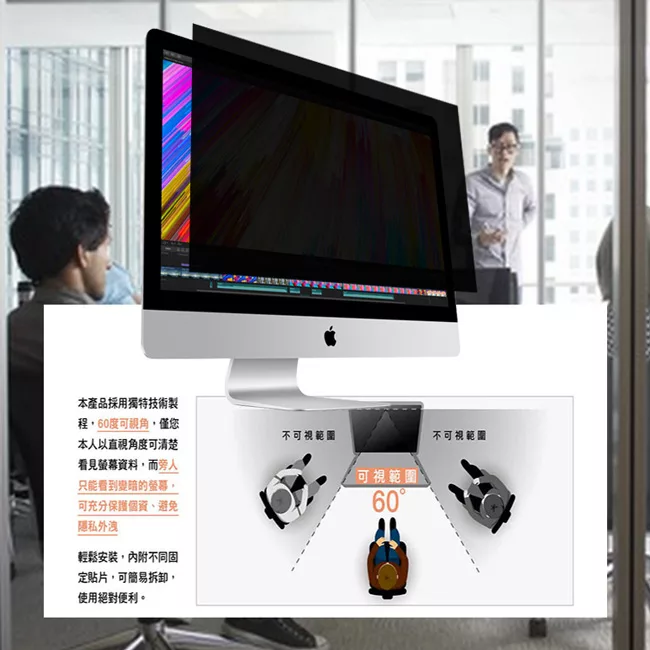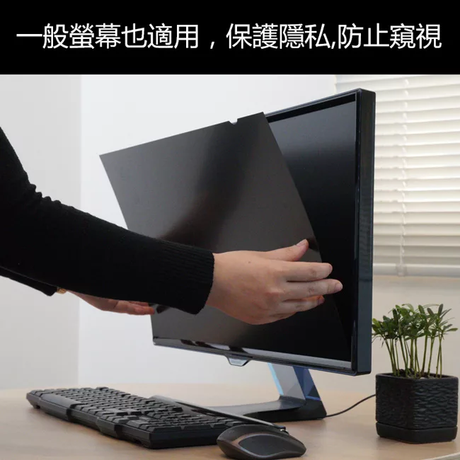 螢幕防窺片能協助維持機密資訊的隱私。僅有位於螢幕正前方的使用者可看到螢幕上的內容,旁人只能看見變暗的螢幕。