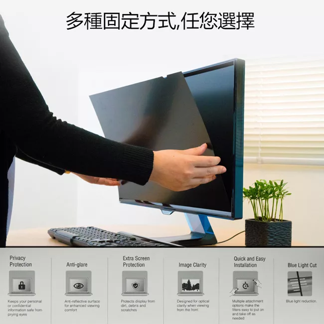 提供您兩種便利的安裝方式。可翻面、無光澤的一面減少眩光和反光。輕、薄的無框設計,防止顯示器螢幕上的灰塵、碎片和刮痕。